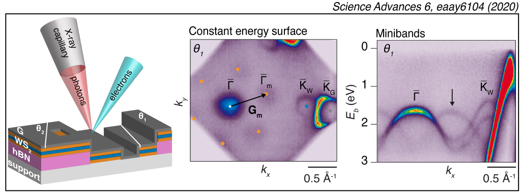We have used an X-ray capillary in order to micro-focus a synchrotron beam and thereby collect the electronic structure of stacks with variable twist angle between graphene and single-layer WS2. This directly revealed the E(k)-dispersion of minibands at optimum twist angles.