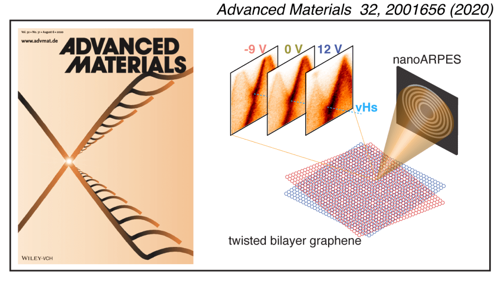 We have investigated the doping dependence of the van Hove singularity in large-angle TBLG devices using nanoARPES, and observe how the hybridised part of the band structure can be shifted near the Fermi level. Further studies closer to the magic angle could provide information on E(k)-resolved many-body excitations in this system.