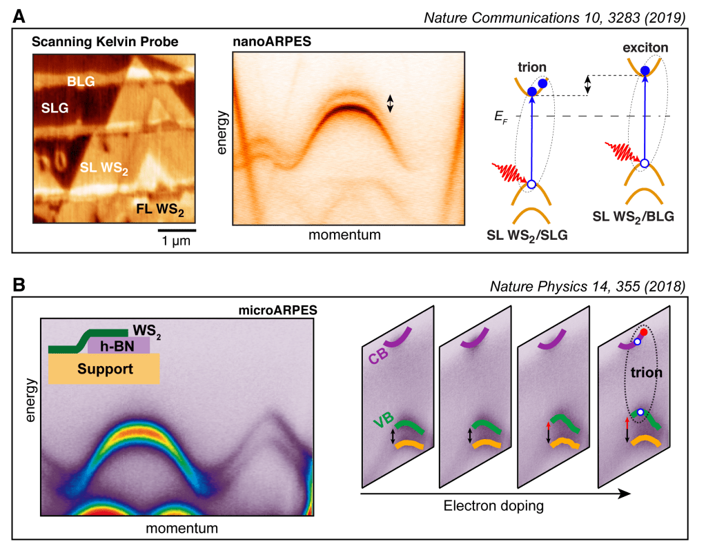 Using angle-resolved photoemission with a microscopic (microARPES) or nanoscopic (nanoARPES) synchrotron beam we have probed how different substrates and doping affect these many-body interactions by measuring the energy and momentum resolved spectral function. By synthesising WS2 on alternating stripes of single-layer graphene (SLG) and bilayer graphene (BLG) we observed a rigid band shift in the WS2, following the workfunction change of the underlying SLG and BLG stripes. This leads to a patterned doping effect in the WS2 that locally affects the formation of excitons and charged excitons (trions) as seen in panel A. At extreme doping levels, such trions were observed to dramatically change the splitting of the valence bands in WS2 transferred on a hexagonal boron nitride (hBN) flake, which we tracked in situ during electron doping as seen in panel B.