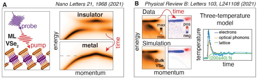 In its bulk form, metallic VSe2 undergoes a periodic lattice distortion when cooled down to 110 K. When thinned down to a single layer, the transition temperature is substantially enhanced, and an additional metal-to-insulator transition emerges. We used intense femtosecond laser pulses to bring the two compounds out of their respective ordered phases, and tracked the evolution of their electronic structures by time- and angle-resolved photoemission spectroscopy.